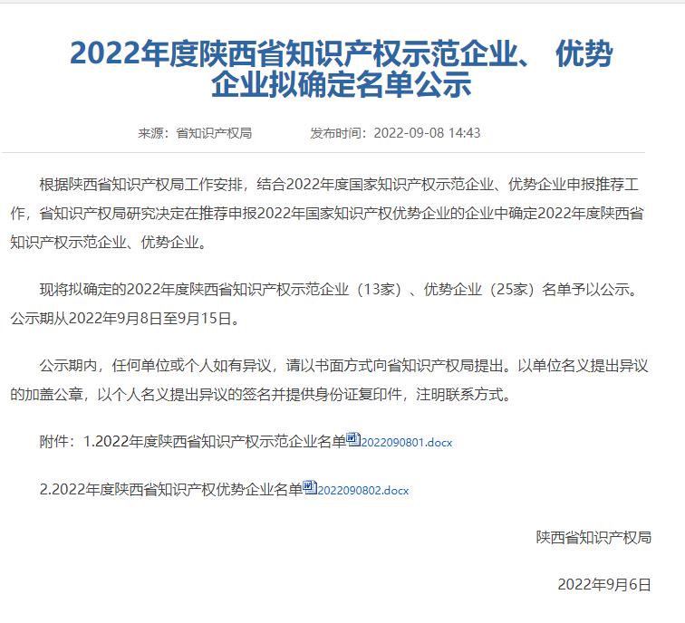 近日,陜西省知識(shí)產(chǎn)權(quán)局公示了“2022年度陜西省知識(shí)產(chǎn)權(quán)示范企業(yè)、 優(yōu)勢(shì)企業(yè)擬確定名單”,我司憑借多年對(duì)知識(shí)產(chǎn)權(quán)工作的深耕,經(jīng)過專家評(píng)審及集體審議后被認(rèn)定為“2022年度陜西省知識(shí)產(chǎn)權(quán)優(yōu)勢(shì)企業(yè)”。